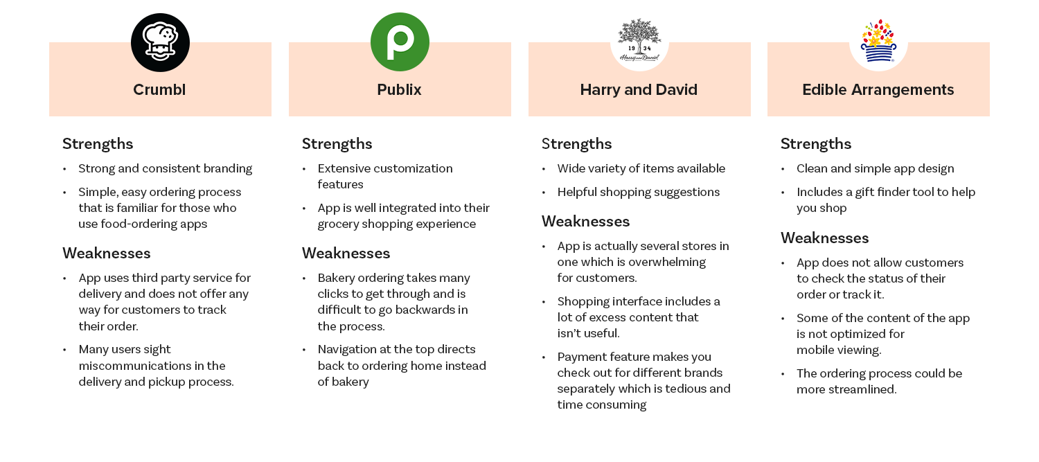 Research involved one-on-one interviews with potential users to understand their feelings and motivations for shopping at the local bakery, as well as challenges in the ordering and pickup process. Secondary market research was also conducted to evaluate competition in the bakery ordering space.