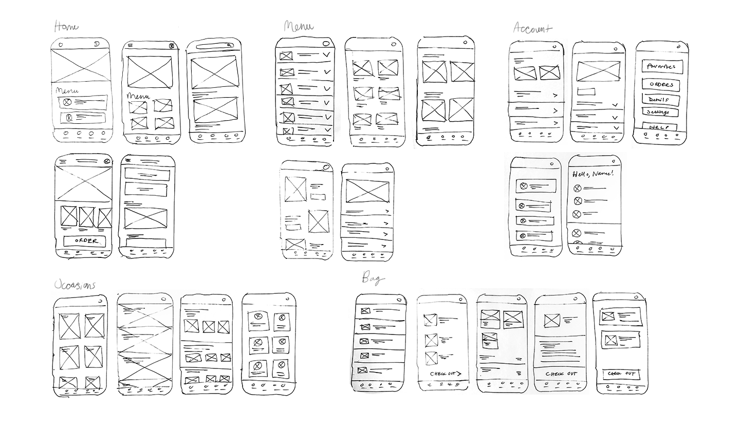 To begin the design phase, I sketched screens of the app on paper. Exploring common design patterns within the mobile food ordering space helped me identify which layouts would work best for completing core tasks.