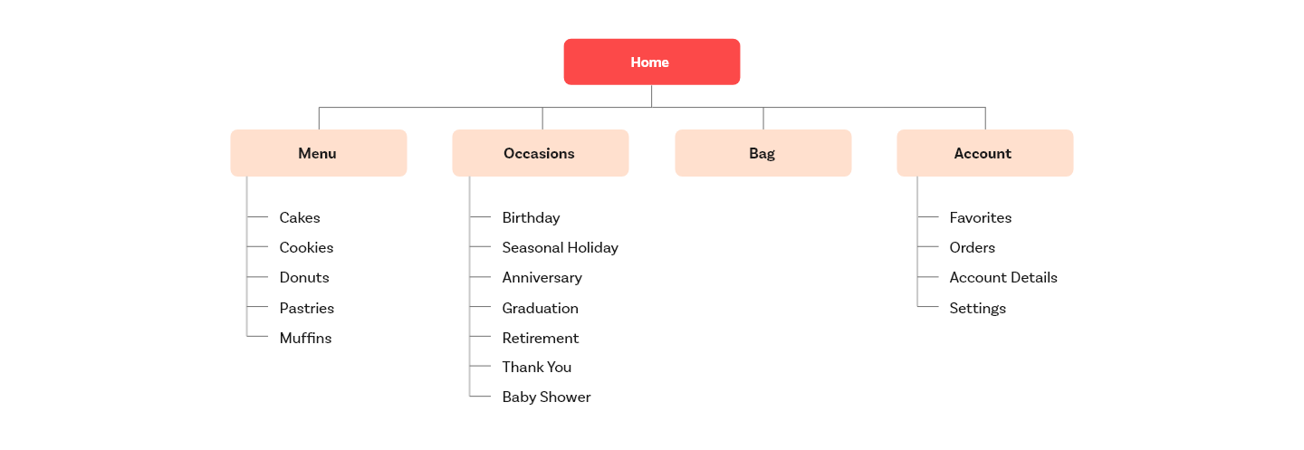 After deciding what features to include in the app, the next step was to organize the content into a sitemap. Key items to lay out were the bakery's menu offerings and the user's shopping details. This visual representation of the product's structure would provide a framework for the design.